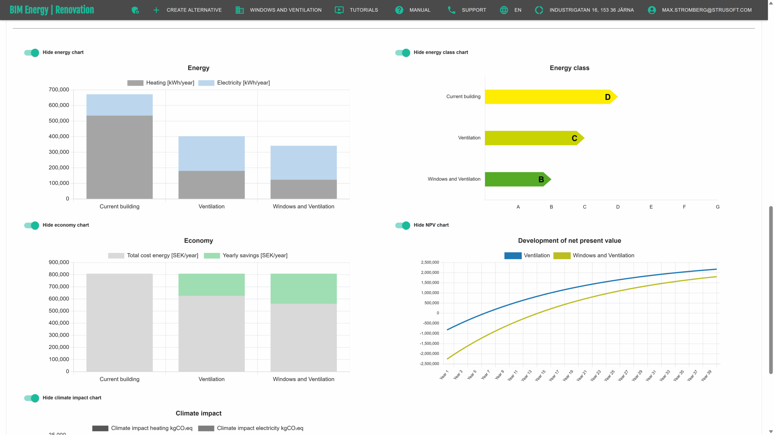 BIM Energyn avulla kiinteistönomistajat, asentajat ja energiakonsultit voivat nopeasti ja tarkasti simuloida olemassa olevien rakennusten energiatehokkuutta ja tunnistaa tehokkaimmat energiasaneeraustoimenpiteet. Tämä johtaa alempiin energiakustannuksiin, parempaan nettotuottoon ja korkeampaan kiinteistön arvoon – samalla kun hiilijalanjälki pienenee. Siinä missä muut ohjelmistot vaativat asiantuntemusta ja vievät päiviä tai viikkoja, BIM Energy tuottaa tulokset minuuteissa.